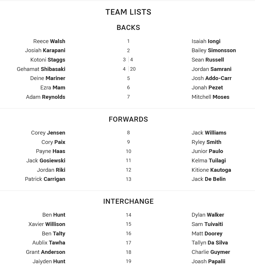 For the Eels, Will Penisini was dominated out yesterday, that means Jordan Samrani steps into the centres in jersey 20, whereas winger Josh Addo-Carr makes an early return from a thumb damage.